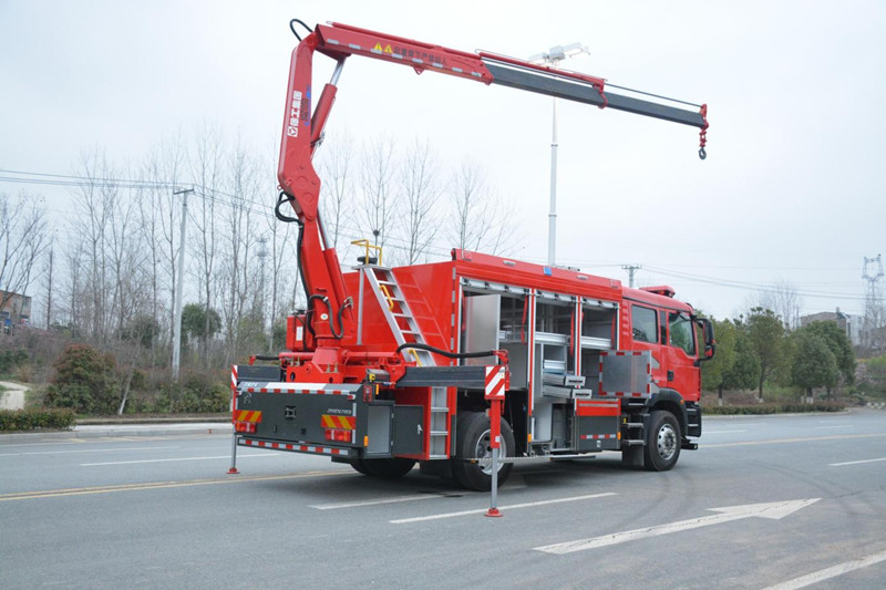 江特牌JDF5130TXFJY90/Z6 搶險救援消防車,整車主要由中國重汽汕德卡底盤、鋁合金上裝廂體、電源保障系統(tǒng)、隨車起重折臂吊機(jī)、高桿照明系統(tǒng)、車載電臺、器材艙、器材架、平式/立式拓展板機(jī)構(gòu)、卷簾門、梯臺、扶手及護(hù)欄、警燈警號、隨車器材及其他附屬設(shè)施等組成。整車改裝后載荷分配均勻,質(zhì)心位置和穩(wěn)定性計(jì)算精確,內(nèi)部空間布局合理,能充分滿足應(yīng)急救援工作需要。
